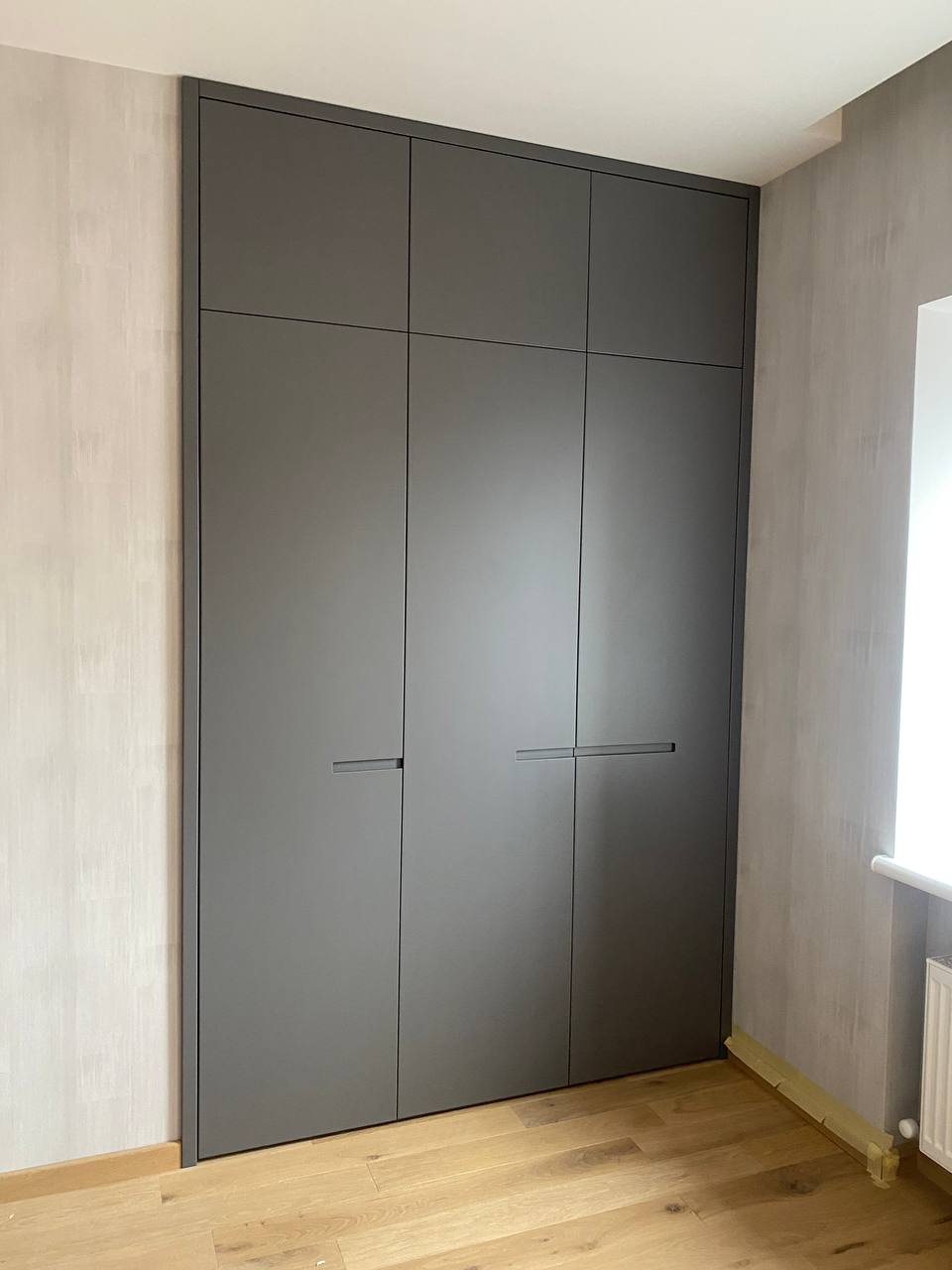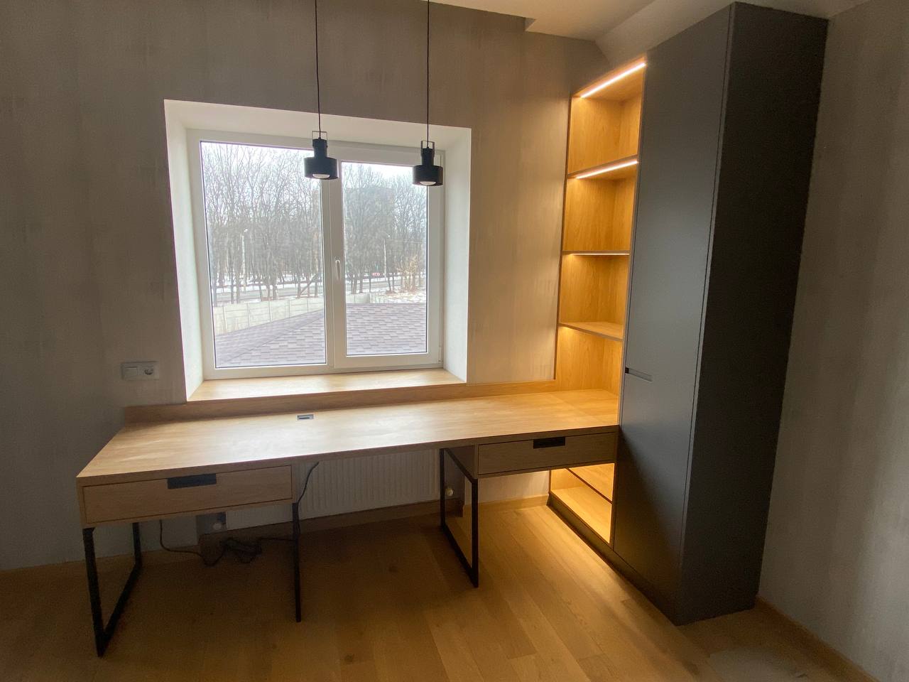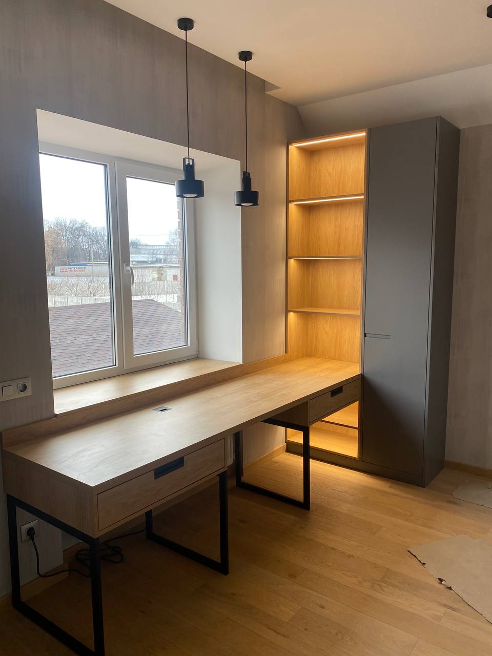 Funkcjonalna zabudowa stworzona z myślą o wygodnej pracy w domu. Szeroki drewniany blat podkreśla naturalny charakter wnętrza, a czarne nogi nadają mu lekkości i nowoczesności. Zintegrowana szafka oraz otwarte półki z ciepłym oświetleniem LED umożliwiają praktyczne przechowywanie i ekspozycję przedmiotów. Konstrukcja idealnie dopasowana do przestrzeni pod oknem zapewnia komfort pracy z naturalnym światłem.