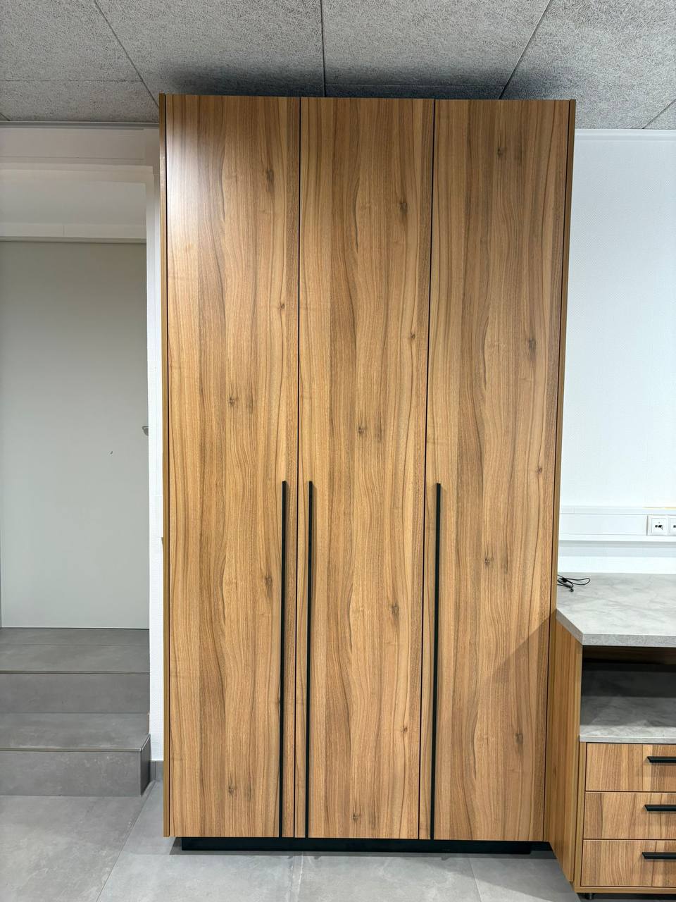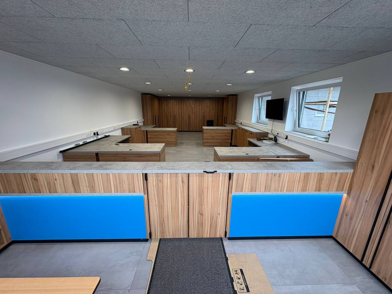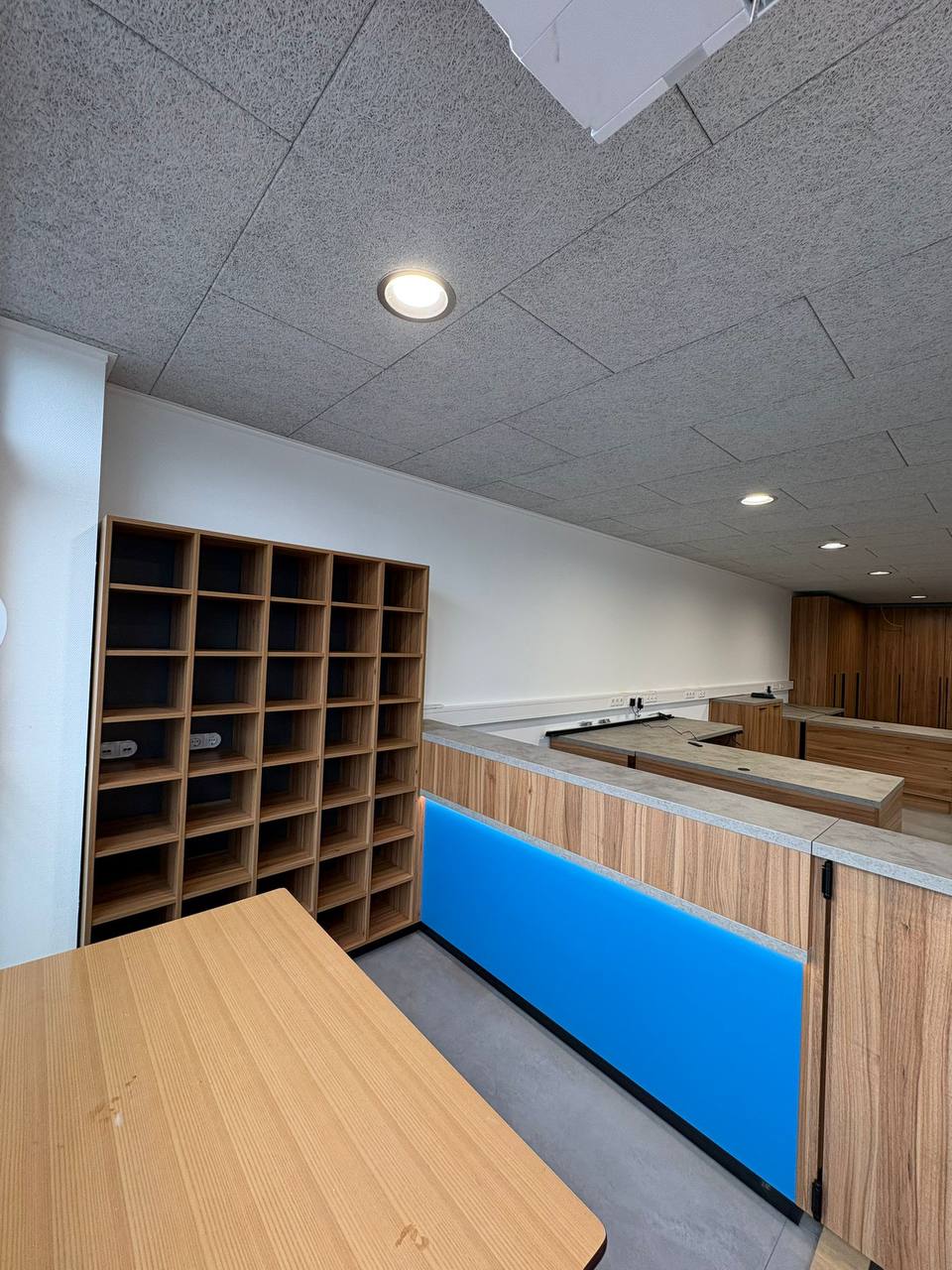 Realizacja wykonana z dominacją mebli z litego drewna w połączeniu z zabudową korpusową. Naturalna struktura drewna nadaje wnętrzu solidny, ciepły charakter, a otwarte moduły ułatwiają organizację dokumentów i akcesoriów biurowych. Kontrastowy panel w żywym kolorze oraz surowy blat podkreślają nowoczesny charakter przestrzeni, zachowując jej funkcjonalność i profesjonalny wygląd.