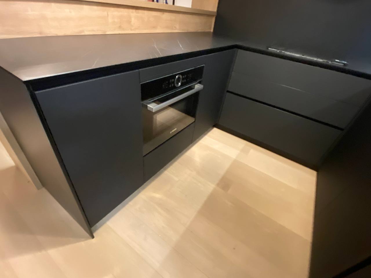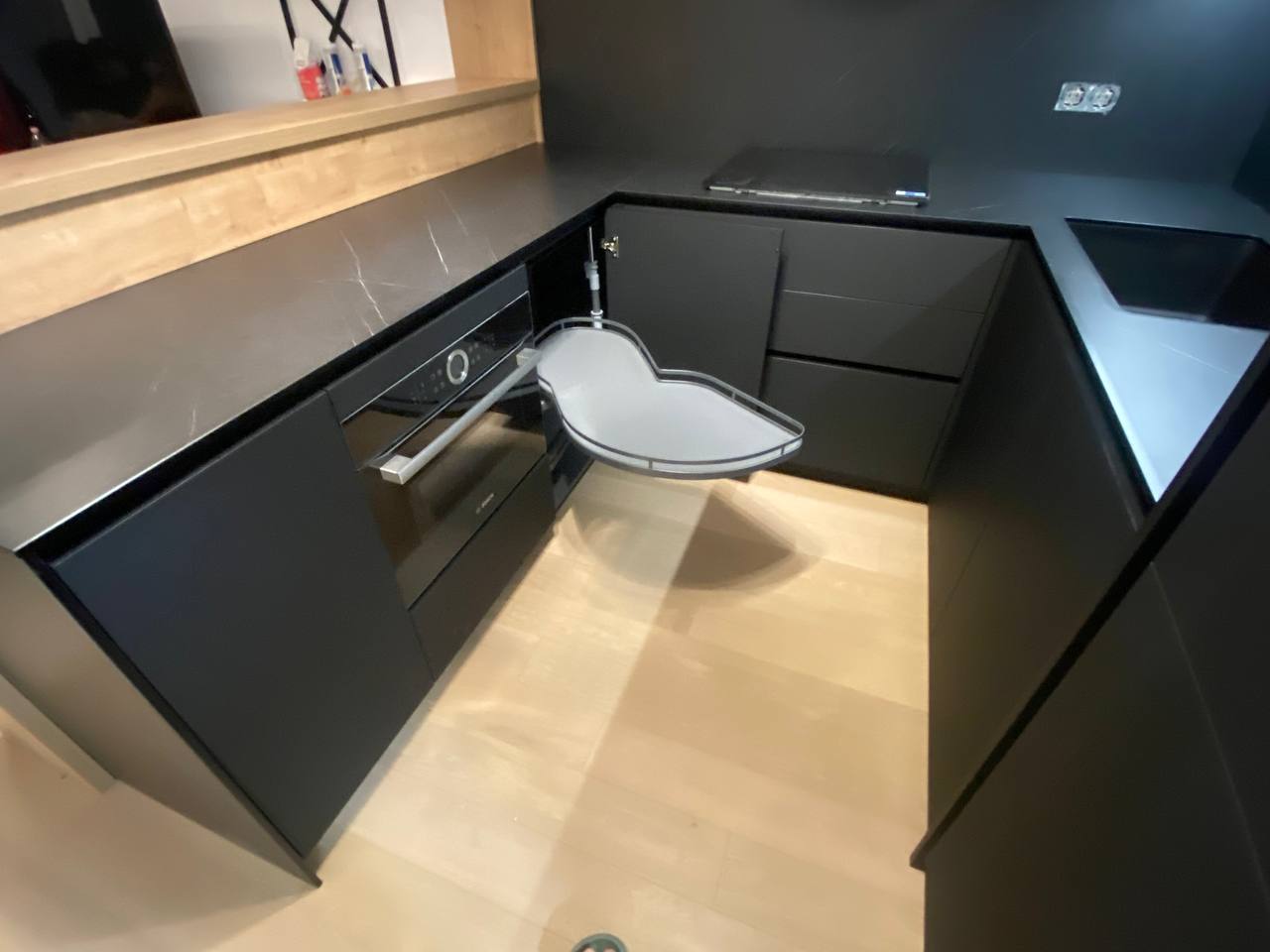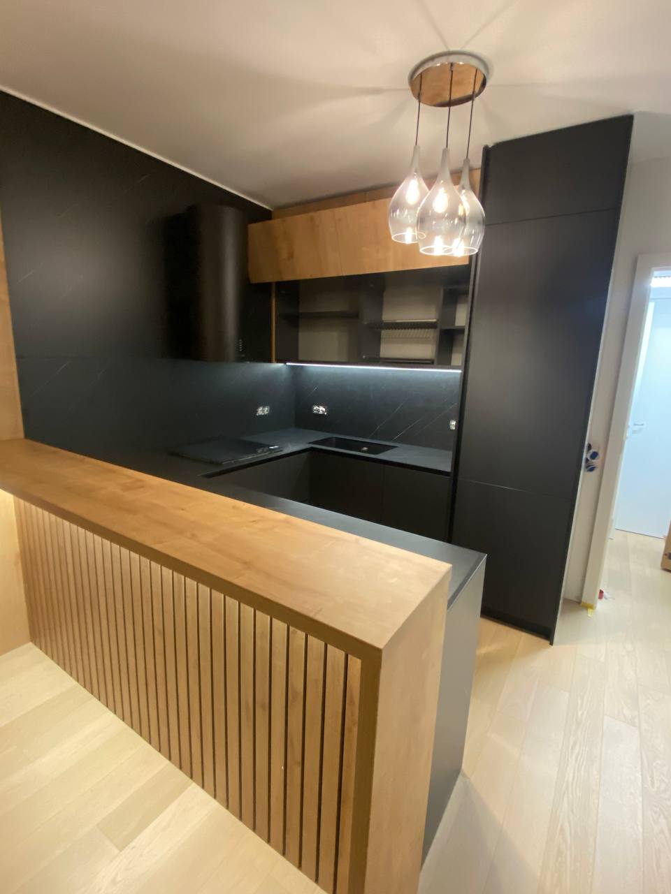 Nowoczesna kuchnia z czarną zabudową i drewnianymi akcentami